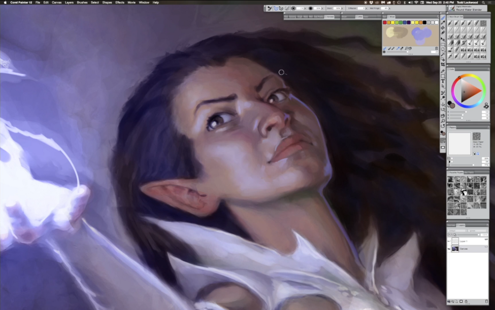 In Part 2 of this demo, Todd will show us how he takes the drawing he created in Part 1, and renders it into a complete finish, all in real time! He will discuss his digital techniques, talk about his approach to color, and discuss some of the aspects unique to creating fantasy art for card games like Magic: The Gathering, all as you see this painting to come life right before your eyes.